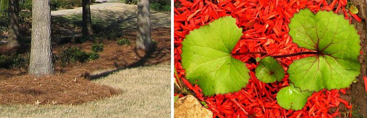 Слева — мульчирование приствольных кругов деревьев хвойным опадом. Справа — мульчирование почвы вокруг декоративных растений цветной мульчей; на фото — молодой бузульник