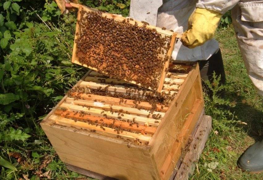 - отобрать у сильных семей 1–2 рамки с расплодом и поместить их в отдельный ящик, выбирая рамки с нелётными молодыми особями и оставляя матку (в ящике должно набраться не менее 6 рамок);
