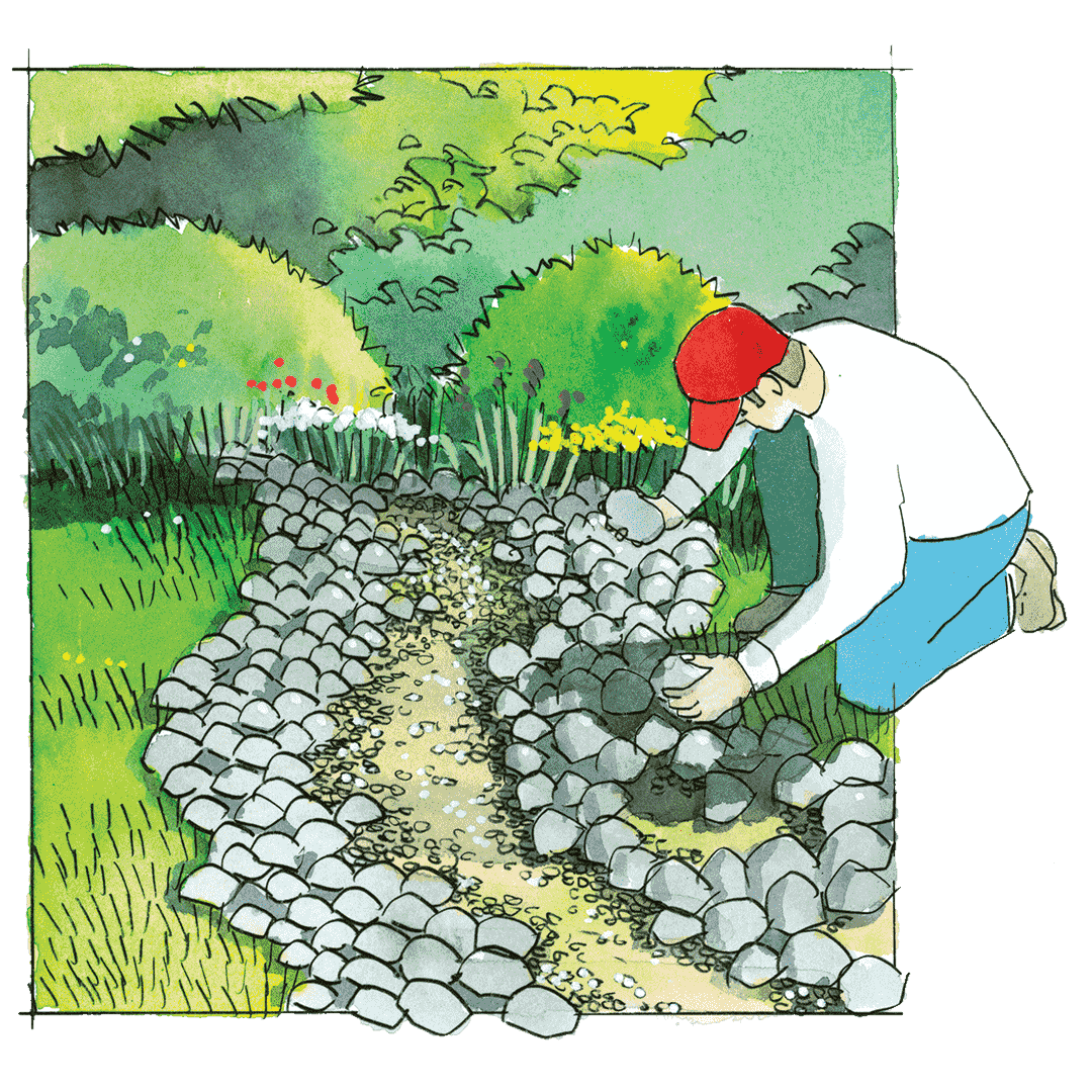 Зона мелководья нашего самодельного ручейка будет оформляться с помощью небольшой гальки или других камней. Бурное течение можно сымитировать, используя плоскую гальку, выложенную на ребре. Центр русла украсьте обтесанным валуном, а вокруг оформите его самодельным водоворотом из гальки.