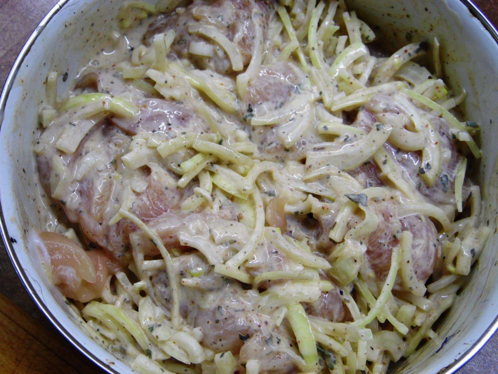 Смешайте 3 стакана кефира, 4 столовые ложки меда и 3 мелко нарезанные луковицы. Маринуйте мясо в смеси 24 часа. Вместо кефира можно использовать сыворотку или натуральный квас.