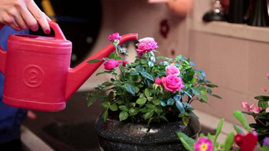 Если домашние розы в горшке содержатся на лоджии или не застекленном балконе, где зимой температура значительно понижается, полив такого растения сводят к минимуму. Грунт увлажняют один или два раза в месяц для предупреждения его полного пересыхания.
