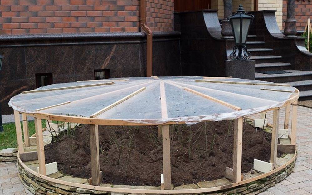 При выращивании огромного количества роз можно смастерить дощатый каркас на всю ширину цветника, после чего натянуть поверх него полиэтилен и прижать его края к земле.