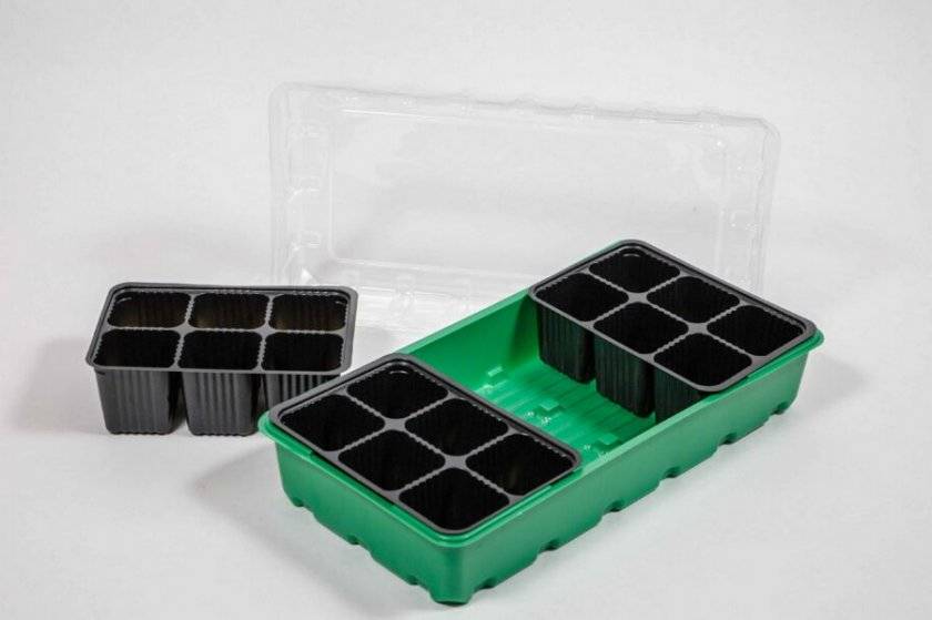 Для высадки семян рекомендуется использовать широкий деревянный ящик средней глубины. Наполнять его грунтом рекомендуется так, чтобы до верхнего края оставалось не менее 3–5 см — это даст возможность накрыть ёмкость плёнкой, не мешая прорастанию посадочного материала. Можно посадить семена в специальные контейнеры для рассады, внутреннее пространство которых разделено на отдельные ячейки.