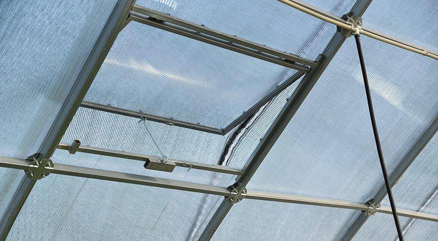 Чтобы предотвратить перегрев в жаркие летние дни, необходимо обеспечить возможность регулярного поступления воздуха в теплицу, особенно это важно для поликарбонатных теплиц, которые значительно теплее стеклянных теплиц и пленочных туннелек. Форточек в верхней части дверей бывает недостаточно, поэтому желательно предусмотреть дополнительные форточки проветривания в боковых стенах и на крыше. Современные производители предлагают автоматические системы вентиляции, которые сами следят за температурой в теплице и при необходимости открывают-закрывают форточки проветривания