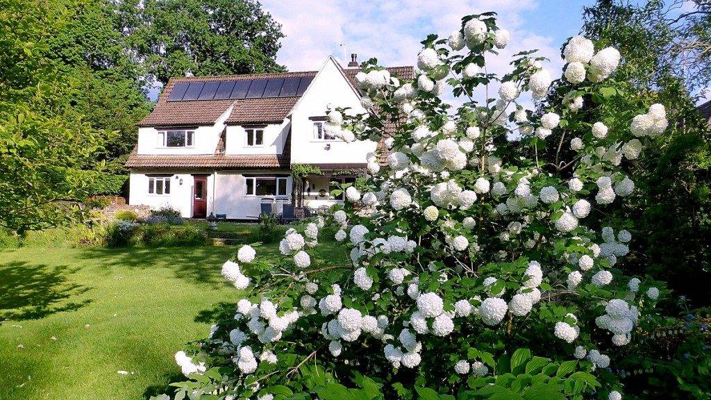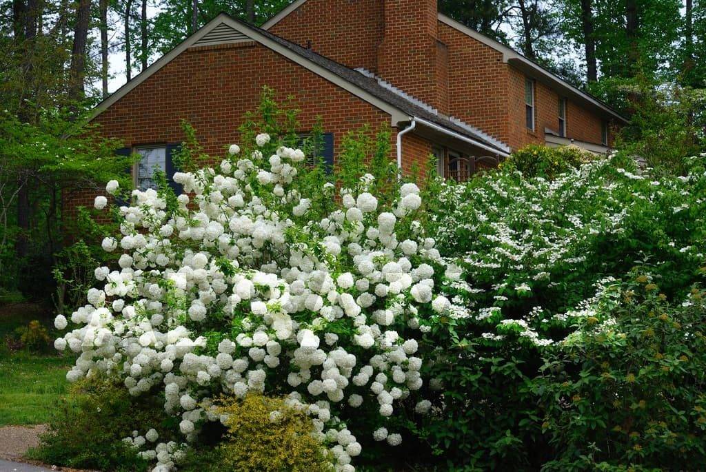 Около дома прекрасно будут смотреться разделенные на группы растения и одиночно высаженный кустарник калины. Его краса подчеркнута тщательно подстриженным газоном, его ослепительно белые цветы становятся более заметными на фоне ярких клумб.