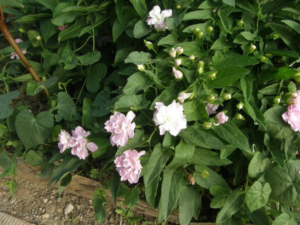 У японской калистегии прочные двухметровые побеги. Цветочки растут на лозе друг за другом, светло-розовые. Лепестки крупные, махровые. Цветут в августе.