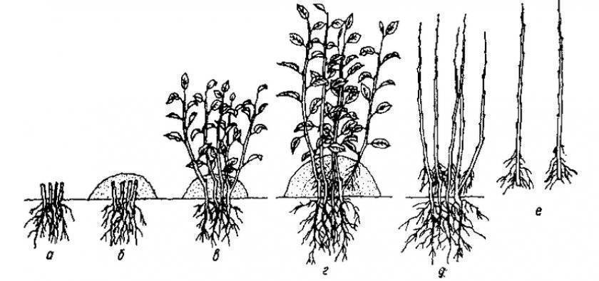 Схема выращивания вегетативных подвоев: а — маточный куст после отделения отводков; б — укрытие почвой куста на зиму; в — весеннее отрастание побегов и первое их окучивание; г—полное окуривание для создания условий для корнеобразования; д — освобожденный от почвы маточный куст, подготовленный к осеннему отделению укорененных отводков; е — срезанные с маточного куста укорененные отводки Корневище зрелых деревьев, развивающееся на дистанции 15–25 см от поверхности земли, можно не вырезать, а использовать для прививания. В этой ситуации прививку делают в весенний сезон путём копулировки (когда у обоих черенков одинаковая толщина) или в летние месяцы методом окулировки (прививка одиночной почкой).