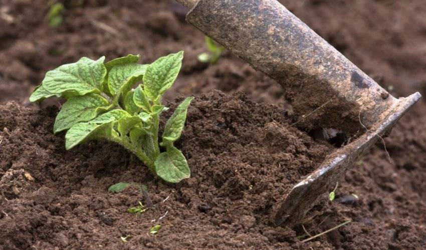 Когда побеги достигнут указанной отметки, рыхление заменяют окучиванием. Цель мероприятия состоит в обеспечении беспрепятственного воздухо- и влагообмена с корневой системой. Проводят процедуру путем подгребания грунта ближе к картофельному кусту так, чтобы при последующем развитии он не клонился к почве.