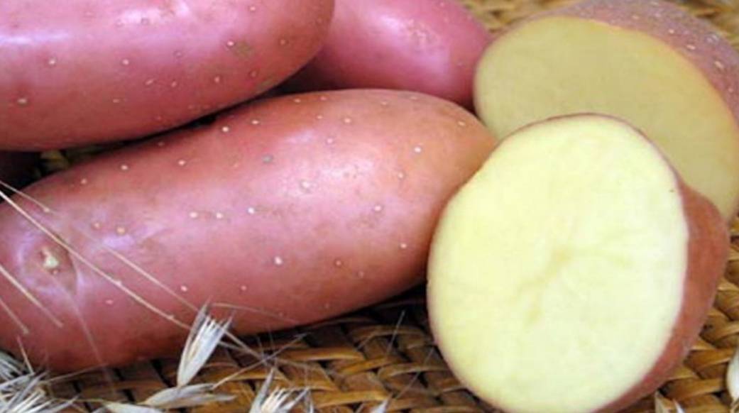 - Кожура розового цвета, гладкая и достаточно тонкая, но прочная. Мякоть светло-желтого цвета. Форма клубней — овально-удлиненная, достаточно правильная. Глазки расположены неглубоко и равномерно распределены по всей поверхности.
