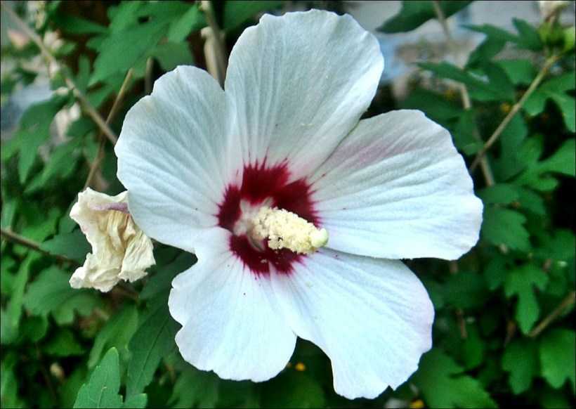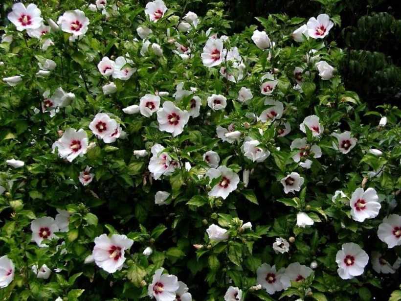 Гибискус сорта Бориас украшен белыми цветками с красной серединкой