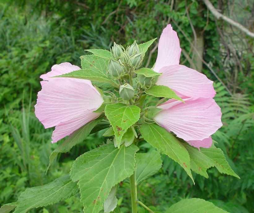 Северный гибискус с белесыми цветами еще называют тройчатым за форму трехлопастных листьев. Он менее приметный, но зато совсем неприхотлив и известен своими целебными свойствами.
