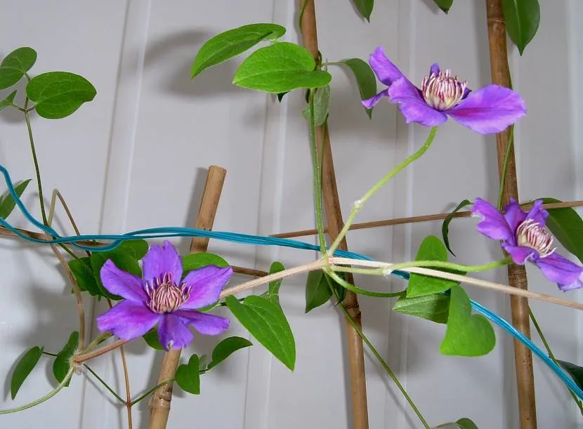 - До посадки клематиса нужно позаботится об установке опор, которыми в дальнейшем будут взбираться лианы; высота такой конструкции (желательно, съемной на зиму) 1,5-2,5 м, что зависит от сорта. Опоры не должны прилегать к стене.