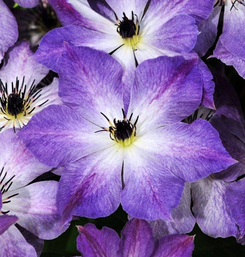 Вырастает куст клематиса до 2,5 м. Цветы преимущественно небольшие, размер составляет 10 см. Темно-фиолетовые, лепестки кажутся черного оттенка. Середина окрашена в контрастный яркий цвет. Лепестки закручиваются вниз, что придает объем. Обильное цветение начинается в середине лета и продолжается до осени. Затем требуется обрезка.