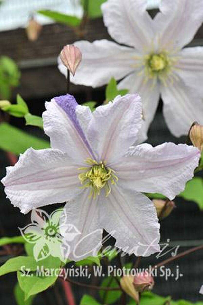 Японский сорт, обсыпанный в начале лета массой звездообразных цветков диаметром 6-8 см с 4-6 широкими эллипсообразными заостренными на концах чашелистиками, со слегка обтрепанными краями, в верхней части закручивающимися вниз. Верхняя сторона чашелистиков белая с розовой тенью, особенно в средней и верхней части, нижняя сторона белая с фиолетово-розовыми нервюрами в середине.Пыльники желтые на зеленых нитях. Цветет обильно в июне-июле и более скромно в августе- сентябре. Листья одиночные тройчатосложенные или складывающиеся из пяти листиков, светло-зеленые, матовые, гладкие. Достигает 2,5 м высоты. За опоры цепляется листовыми черешками. Особенно подходит для выращивания у оград, беседок, пергол и различных садовых опор. Очаровательно выглядит, переплетаясь с небольшими деревьями либо кустарниками, как лиственными, так и хвойными. Особенно красиво выглядит на темном фоне.