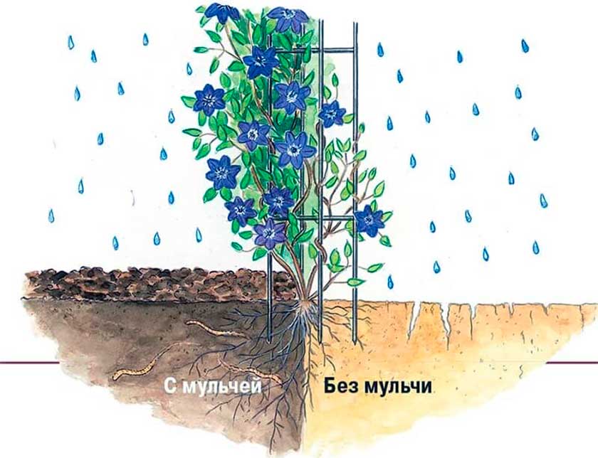 Прикрытие прикорневой зоны опилками, компостом или сеном позволяет сохранить микроклимат почвы и тормозит процесс разрастания сорных трав. Обновлять мульчу следует ежемесячно во избежание прения и плесневения субстрата. В качестве мероприятий по подготовке к зимовке выступает влагозарядный полив.