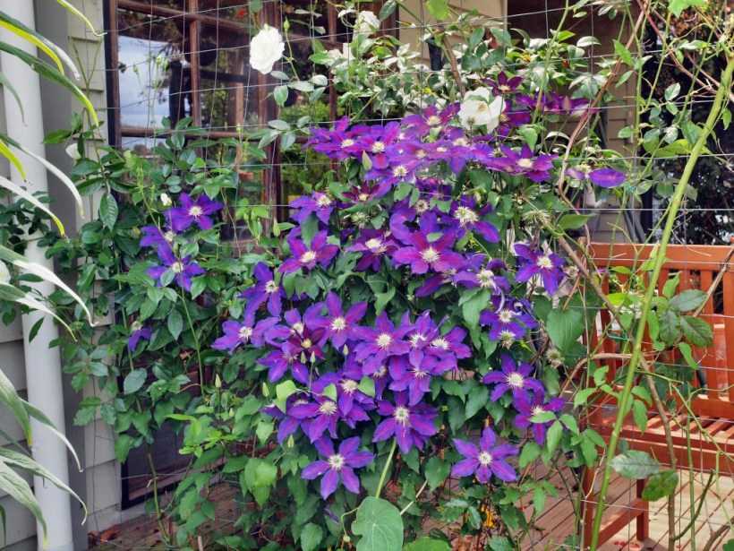 Растение клематис нередко используют и для оформления крыльца, а вопрос «Как сделать опору в этом случае?», решается предельно просто. Из шнура или проволоки формируются шпалеры, которые крепятся под навесом или над дверью одним концом, а вторым — к колышку, вбитому в землю рядом с кустом.