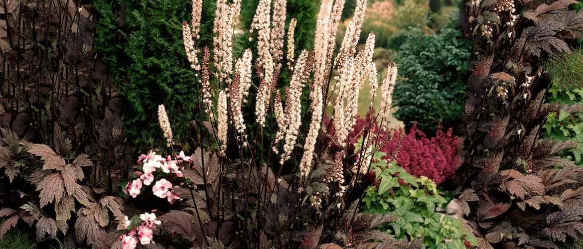 Двухметровые цветоносы клопогона ветвистого (С. ramosa) появляются тоже осенью. Но современные сады чаще всего украшены его сортами. Наиболее распространены: ‘Atropurpurea’ с красно-коричневой листвой, зеленеющей к осени, и с белыми душистыми соцветиями высотой более 1,5 м; ‘James Compton’ с необычными, стальными переливами на пурпурной листве и белоснежными цветками, обрамленными контрастными темно-пурпурными чашелистниками; ‘Pink Spike’, у которого бронзово-пурпурные краски на листьях усиливаются к концу лета, а густо расположенные цветки с пурпурными чашелистниками придают всему соцветию розовый цвет.
