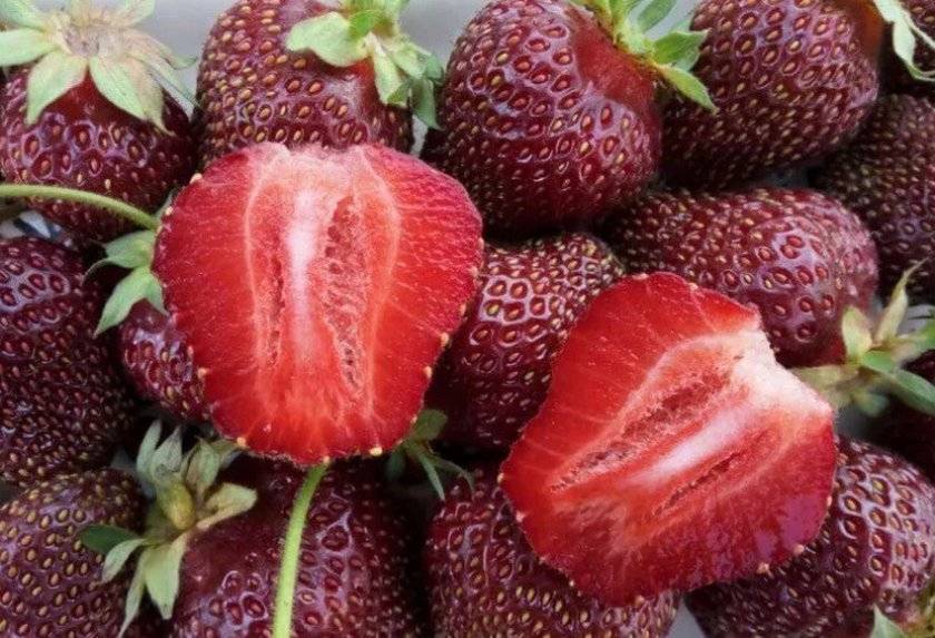 Ягоды клубники Чёрный принц отличаются очень тёмным цветом, поэтому название сорта можно считать вполне оправданным. Поверхность кожицы покрыта большим количеством семечек, из-за которых плоды кажутся немного колючими или шероховатыми. По форме все клубнички напоминают усечённый конус, а под среднетолстой кожицей находится ярко-красная плотная мякоть, привлекательного кисло-сладкого вкуса.