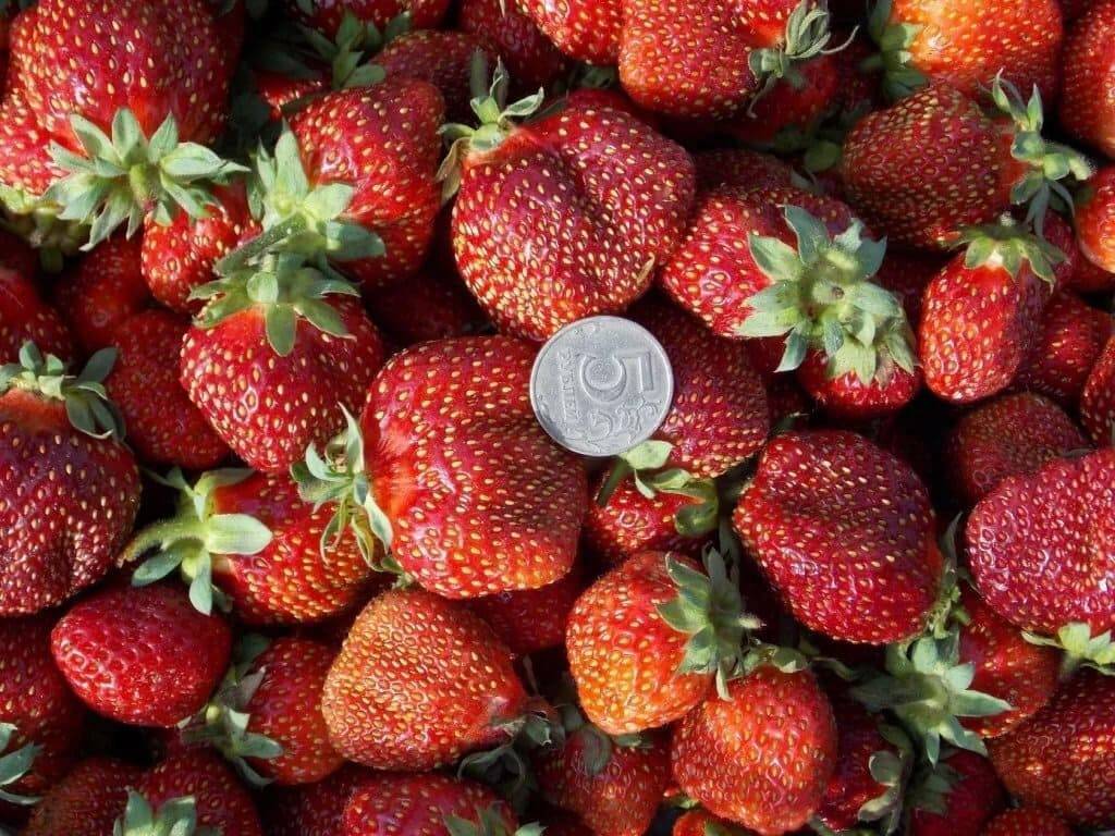 Главной особенностью этого сорта является ровность ягод, они одинаковые по форме и размеру. Средняя масса одной ягоды составляет от 30 до 60 граммов, но встречаются экземпляры в 90-100 граммов. Есть факты и доказательства о получении садоводами ягод размером с куриное яйцо. К концу периода цветения плотность мякоти повышается.