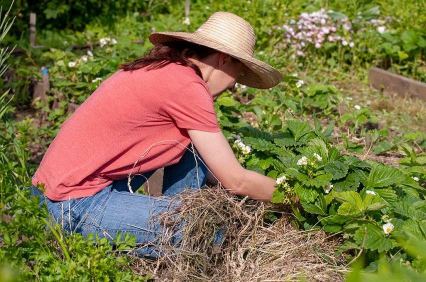 Мульчируют клубнику Гаригуэтта сразу после посадки, независимо от того, каким методом культура выращивается: на открытой территории или в теплице. Используют солому любых злаковых, торф или хвою. Рыхление при высадке на агроволокно не требуется. Под укрытием сохраняется влага, верхний слой грунта не пересыхает. Без использования специального материала почву рыхлят по мере образования сухой корки, это необходимо для беспрепятственного доступа кислорода к корневой системе. Прополка необходима для удаления сорняков.