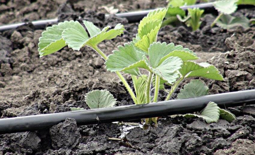 - Поливать клубнику нужно интенсивно, иначе плоды вырастут мелкими и невкусными. Лучше всего Гаригет воспринимает капельное орошение. Еще можно поливать кусты по бороздам и каналам, проложенным непосредственно около кустов.
