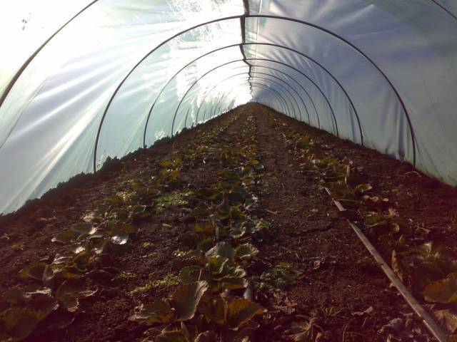Ранней весной для лучшего роста над клубникой Гаригуэтта рекомендуется ставить дуги и натягивать пленку.