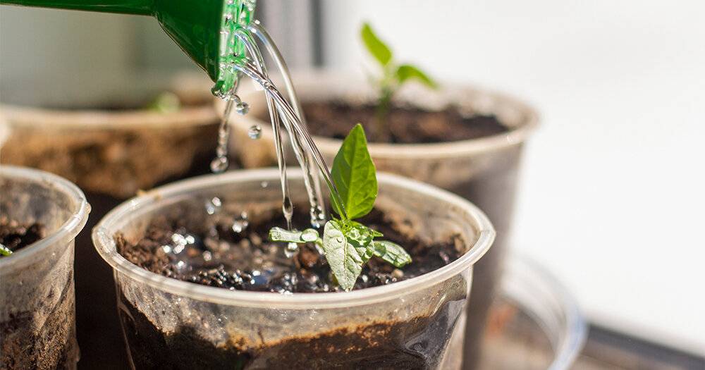 Воду берут на пару градусов выше комнатной температуры. Первые всходы только опрыскивают из пульверизатора. Поливать сеянцы можно водопроводной водой, если предварительно она отстоится в течение 2-3 дней. После полива воде дают стечь в поддон, а затем выливают.
