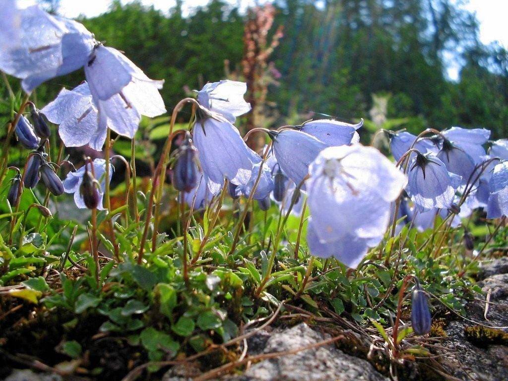 Карликовые виды хорошо подходят для обустройства ковра из цветов. Высота спиральнолистного колокольчика всего 15 см. Это дикий горный вид с красивыми синими цветоносами. Сажают их семенами, при этом сорт быстро покрывает всю площадь клумбы.