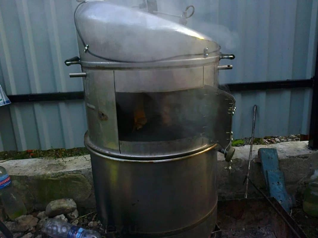 Эксплуатация дровяного агрегата достаточно сложна, так как в течение цикла приготовления деликатесов нельзя оставлять его без внимания. Чтобы рационализировать процесс и создать удобные условия для обработки продуктов, умельцы предлагают немного переделать коптильню из бака: