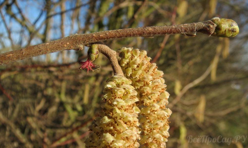 Весной побеги украшают серые сережки. После распускания они приобретают ярко-красный цвет. Плодоношение лещины начинается в конце лета. Плоды имеют крупные размеры.