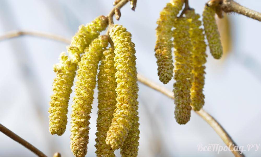 Если растение развивается нормально, то оно обязательно зацветет. Начало цветения приходится на апрель, при этом цветки распускаются до того, как раскроется листва. После того как воздух на улице прогреется до 12 градусов, сережки орешника начинают активно расти, при этом каждые 24 часа их длина увеличивается на 30 мм. Также следует учесть, что чем более сухой будет воздух, тем быстрее будет рост сережек. После того как их длина будет равна 10 сантиметрам, они станут неплотными, и начнется разбрасывание пыльцы. Продолжительность данного пыления 4–12 суток. Женские цветки остаются раскрытыми на протяжении 14 дней. Пыльца с мужских цветков попадает на женские, при этом она может прилететь не только со своего, но и с расположенного неподалеку дерева. Именно с этим связана рекомендация, что на участке должно расти не меньше 3 экземпляров орешника.