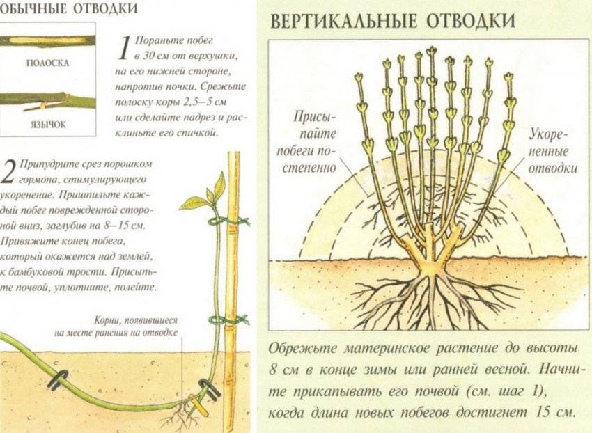 Для размножения отводками нужны однолетние побеги. Возле них выкапывается бороздка 15–20 см глубиной, куда укладывается побег и присыпается почвой. Сверху обильно орошается тёплой водой. Верхушку побега нужно подвязать к забитому подле колышку.