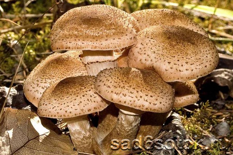 Осенние опята самые большие представители своего вида, так как их шляпка в диаметре достигает 15-17 см. В середине шляпки есть выпуклый бугорок, а по поверхности расположены бурого цвета мелкие чешуйки. Юбочка, обрамляющая ножку, со временем отрывается и образует покрывало, повисшее под шляпкой. Иногда при засушливых летних месяцах осенние опята встречаются даже на засыхающих лиственных деревьях на высоте примерно 2-3 м от земли. Поэтому с собой нужно иметь большую палку с крюком, чтобы собирать эти плодовые тела.