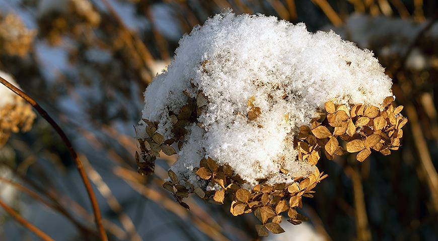 То, скорее всего, ей вообще ничего не грозит, и она будет просто зимой украшать ваш сад. Максимум, что с ней может случиться: это под тяжестью снега тяжелые соцветия могут поломать куст. Это неприятно, но не смертельно. Обрежете все по весне на нужную вам высоту. Гортензия прекрасно переносит обрезку, в том числе и омолаживающую “на пень”.