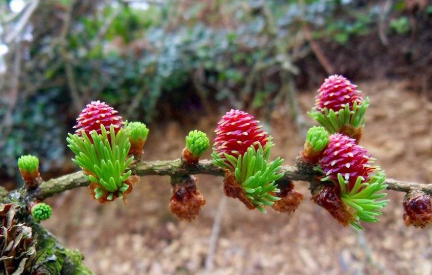 Дерево однодомное, мужские колоски мало примечательны, женские, наоборот, привлекают взгляд своим красным или розовым цветом. Они не висят, как у елей, а растут вверх – эта же особенность имеется и у кедров. На фото шишки лиственницы:
