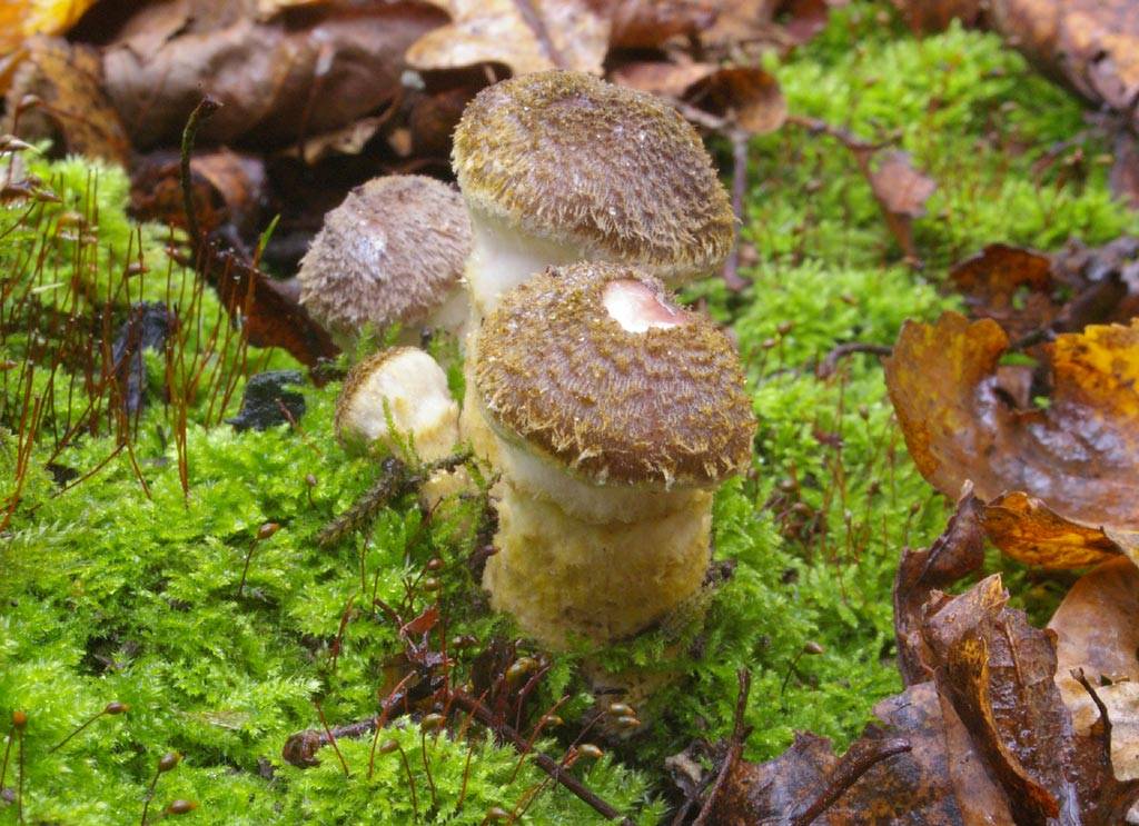У этого гриба круглая красно-коричневая шляпка с завернутыми вниз краями, ножка гриба тонкая и волокнистая, без кольца. Он растет на покрытых мхом пнях и корягах лиственных деревьев.