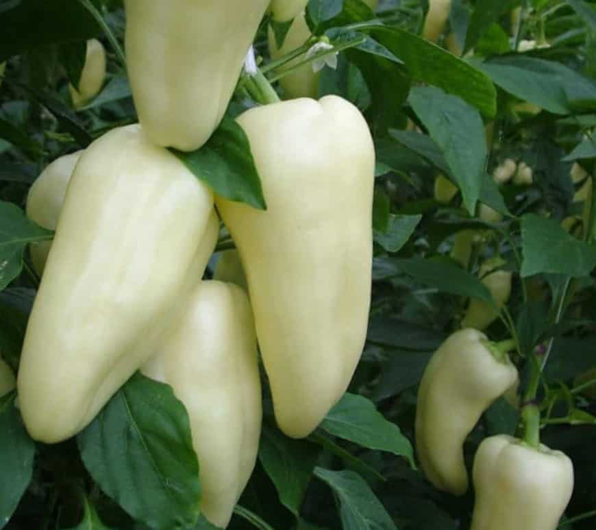 - Белая леди F1. Один куст занимает небольшое место. Раннеспелые перчинки вырастают сладкими и по форме выглядят как куб. Со временем созревания мякоть изменяется с белого на оранжевый цвет.