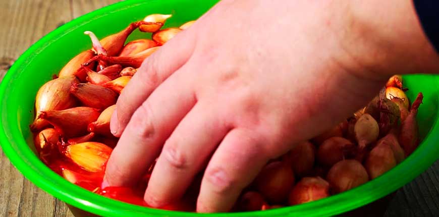 За день до высаживания весь посевной материал вымачивают в растворе медного купороса или марганца. Процедура длится 25-40 минут, после чего лучок просушивают.