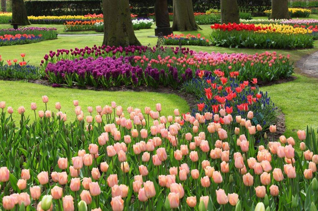 Между тюльпанами также принято высевать коврик из однолетников, например, незабудки или иберис. Луковичные садовые цветы нуждаются в сопровождении. Вариантов бесконечное множество. Можно создавать разные архитектурные инсталляции экспериментирую с цветом, создавая однотонные или разноцветные картины.