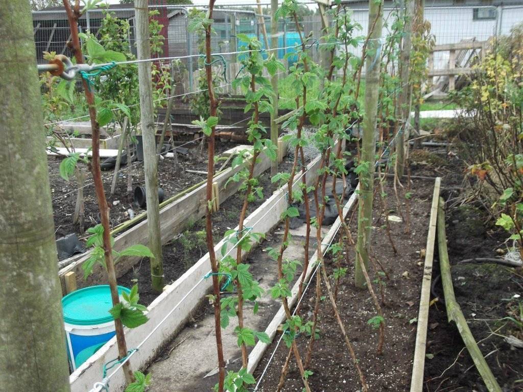 Когда растение достигнет 0,8 м, необходимо оборудовать шпалеру. С ее помощью малина будет лучше освещаться солнцем, выдержит сильный ветер и не сломается под тяжестью плодов.