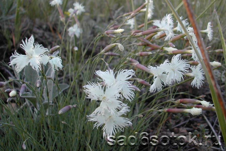 • Гвоздика песчаная — маленькое растение с перисто-бахромчатыми цветами. Ее декоративная форма «Ностальжи». Многочисленные белоснежные цветочки с бахромчатыми кромками изобилующим цветением приукрашивают миксбордеры, бордюры, скальные горки и опорные стенки. Располагают на солнечном месте с легкой водопроницаемой, известкованной землёй. Растение нетребовательно. Отлично выдерживает пикировку. Расцветание обычно проходит в июле-августе. Вышина насаждения 20−30 см.