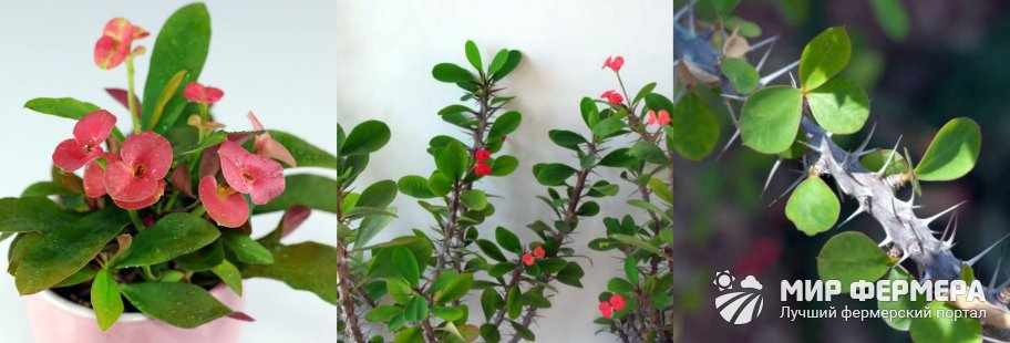 - Euphorbia milii, лат. Молочай Миля — у него мелкие овальные листочки и шикарные розовые или желтоватые соцветия;