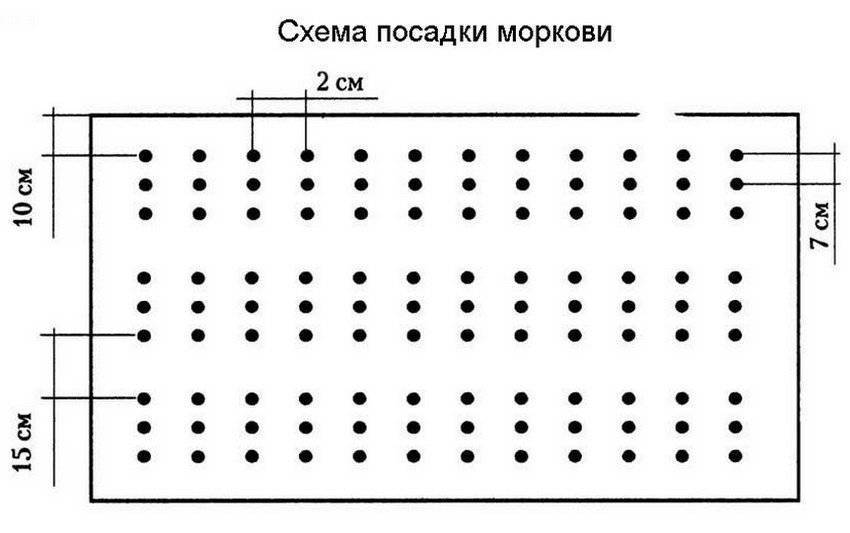 Подготовка грядки к посеву моркови предусматривает предварительное удобрение комплексными минеральными удобрениями, рыхление и разравнивание грядок, с дальнейшей организацией лунок. Схема заделки морковных семян 20×40 см, что означает ширину в 20 см между соседними бороздами и 40 см между соседними грядками. Семечки в бороздах размещают на удалении 2 см друг от друга.