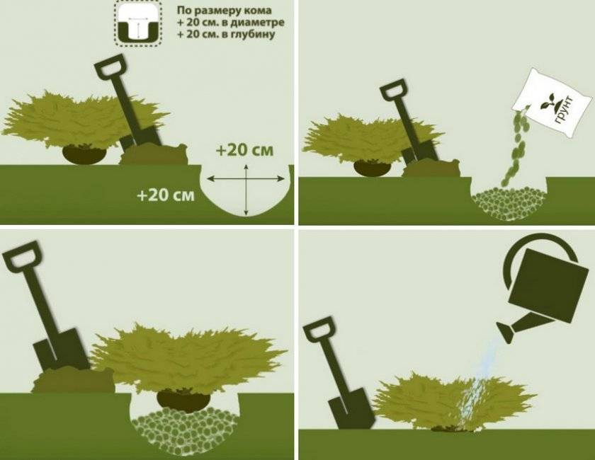 - Выкопать посадочную лунку. Ее размеры в 2-3 раза должны превышать размеры корневища можжевельника
