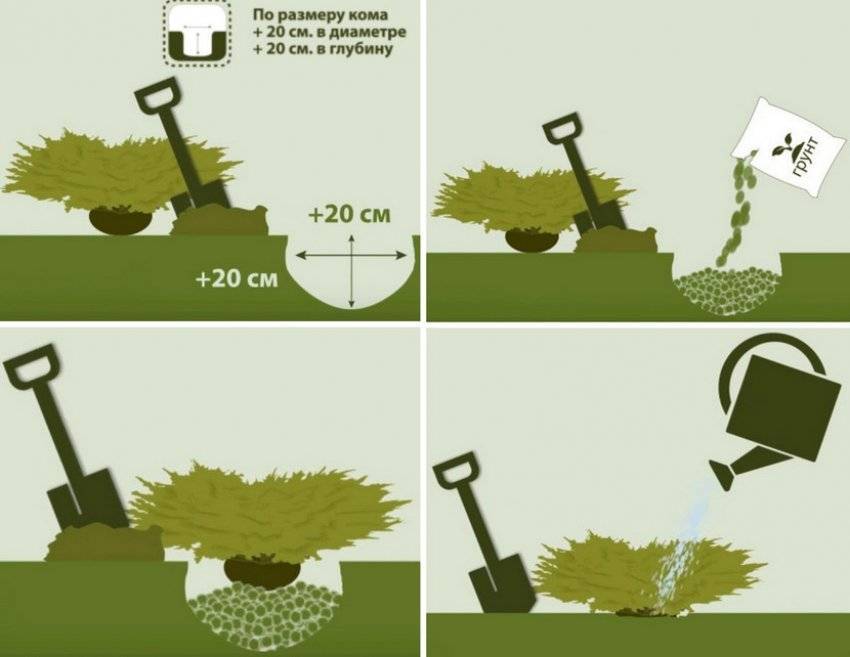 Чтобы можжевельник быстро прижился, его необходимо высаживать в весенний или осенний период. Ямку выкапывать нужно в соответствии с размерами купленного саженца. Грунт нужно подготовить — смешать по одной части песка и дерна с двумя частями торфа.