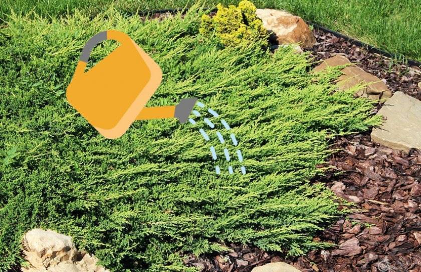 Активный полив важен для хвойных в первые месяцы после посадки в открытый грунт. Далее можжевельник горизонтальный берёт влагу из воздуха и при поливе дождеванием. Он производится из мелкой лейки. Такой способ полива подходит экземплярам с неплотной кроной, а более густые поливают под корень, чтобы избежать возникновения гнили внутри шапки хвои.