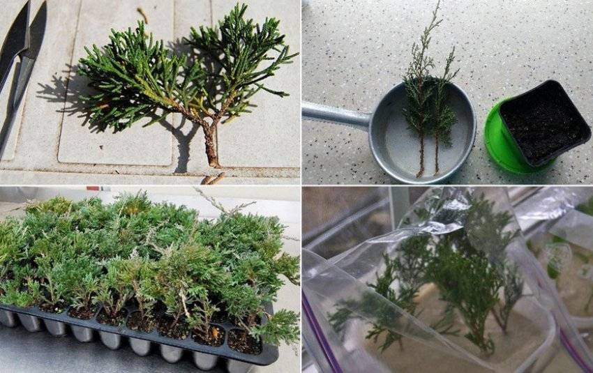 Черенки — второй по популярности способ размножения растения. Для правильной заготовки их срезают в апреле или мае, берут побег не длиннее 12 см так, чтобы на ветке остался кусок коры, затем очищают от иголок до этого участка с корой, а после высаживают в песок, смешанный с торфом в пропорции 1:1. Ведро или горшок с черенком регулярно опрыскивают водой и ждут укоренения. Спустя 2 месяца можно высаживать растение в грунт. На зиму молодой можжевельник всегда укрывают нетканым полотном или агроволокном.