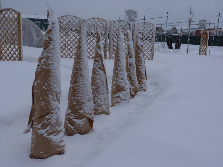 Сначала окучивают толстым слоем торфа, измельченной сосновой корой или опилками. Затем веточки пригибают к центральному стволу, подвязывают шпагатом, заворачивают мешковиной или обкладывают еловым лапником.