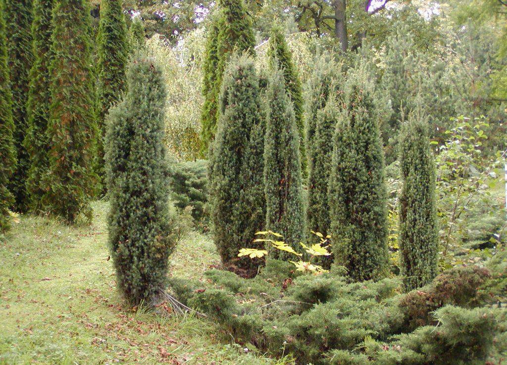 Сама форма в виде колонны используется в качестве солитера на клумбе или газоне. Так же можно обыграть цвет голубовато-зеленой хвои, составляя группы посадок вместе с лиственными деревьями.