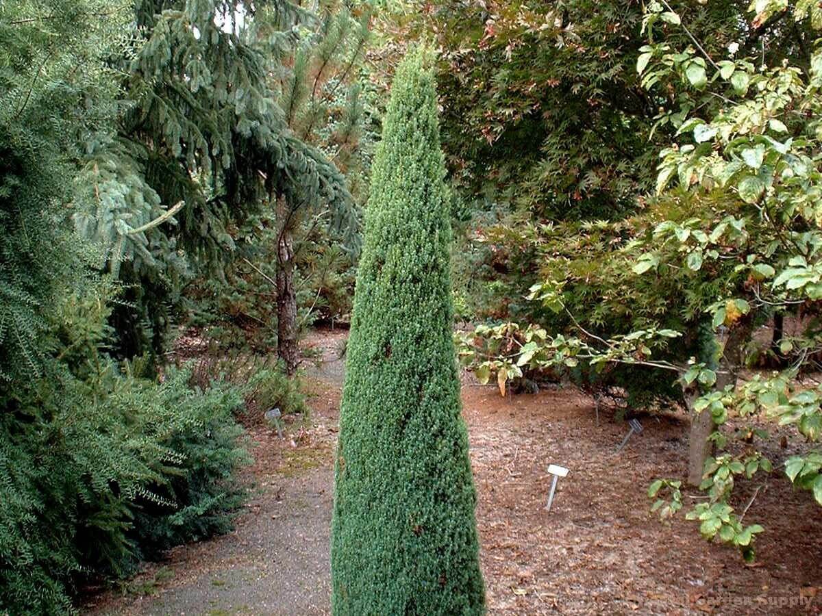 Широкораскидистый вид до 3,5 м во взрослом возрасте обладает приподнятыми чуть поникающими побегами и горизонтальными боковыми ветвями. Расцветка на фото в основном желтовато-зеленая, но могут присутствовать светлые золотистые вкрапления за счет однолетних побегов.